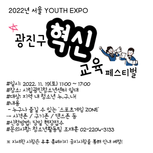 | 2022³â ¼¿ï YOUTH EXPO '±¤Áø±¸ Çõ½Å±³À° Æä½ºÆ¼¹ú' ÁøÇà ¾È³»! | ||