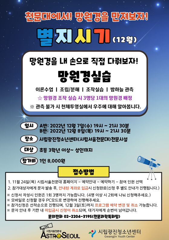 ¾È³çÇϼ¼¿ä, ½Ã¸³¼¿ïõ¹®´ëÀÔ´Ï´Ù. 2022³â 12¿ù 'º°Áö½Ã±â' ÇÁ·Î±×·¥ÀÌ ¾Æ·¡¿Í °°ÀÌ ¿î¿µµÊÀ» ¾Ë·Áµå¸³´Ï´Ù. ¸ðÁý ¿¹¾àÀº 11.24.(¸ñ) 14½ÃºÎÅÍ ¼±Âø¼øÀ¸·Î ÁøÇàµË´Ï´Ù.