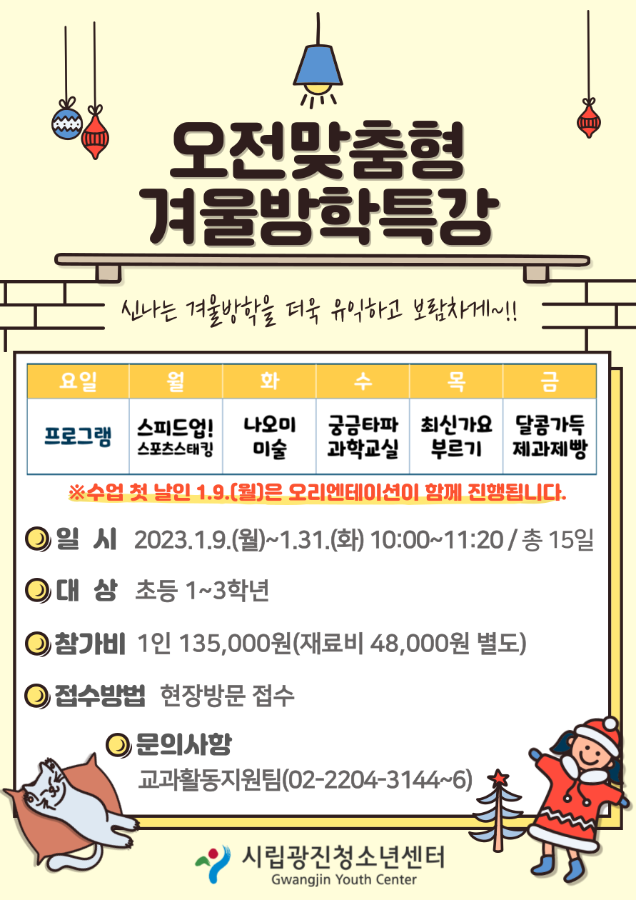 ¡ÛÀϽà : 2023.1.9.(¿ù)~1.31.(È) 10:00~11:20 / ÃÑ 15ÀÏ ¡Û´ë»ó : Ãʵî 1~3Çг⠡ÛÂü°¡ºñ : 1ÀÎ 135,000¿ø(Àç·áºñ 48,000¿ø º°µµ) ¡ÛÁ¢¼ö¹æ¹ý : ÇöÀ广¹® Á¢¼ö ¡Û¹®ÀÇ»çÇ× : ±³°úȰµ¿Áö¿øÆÀ(02-2204-3144~6)