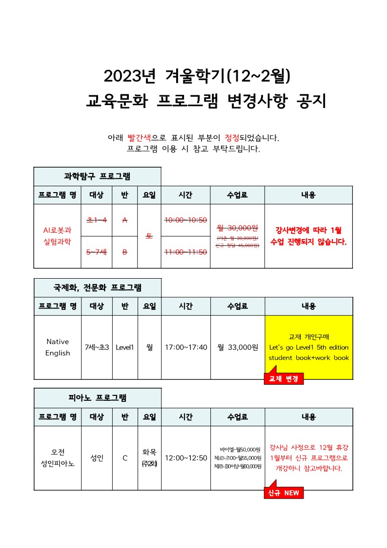 | °Ü¿ïÇбâ(22³â12¿ù~23³â 2¿ù) ±³À°¹®ÈÇÁ·Î±×·¥ º¯°æ»çÇ× °øÁö(12.22. ±âÁØ) | ||