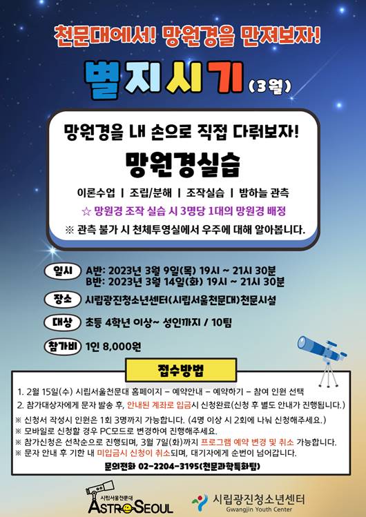 ¾È³çÇϼ¼¿ä, ½Ã¸³¼¿ïõ¹®´ëÀÔ´Ï´Ù. 2023³â 3¿ù 'º°Áö½Ã±â' ÇÁ·Î±×·¥ÀÌ ¾Æ·¡¿Í °°ÀÌ ¿î¿µµÊÀ» ¾Ë·Áµå¸³´Ï´Ù. ¸ðÁý ¿¹¾àÀº 2.15.(¼ö) 14½ÃºÎÅÍ ¼±Âø¼øÀ¸·Î ÁøÇàµË´Ï´Ù.