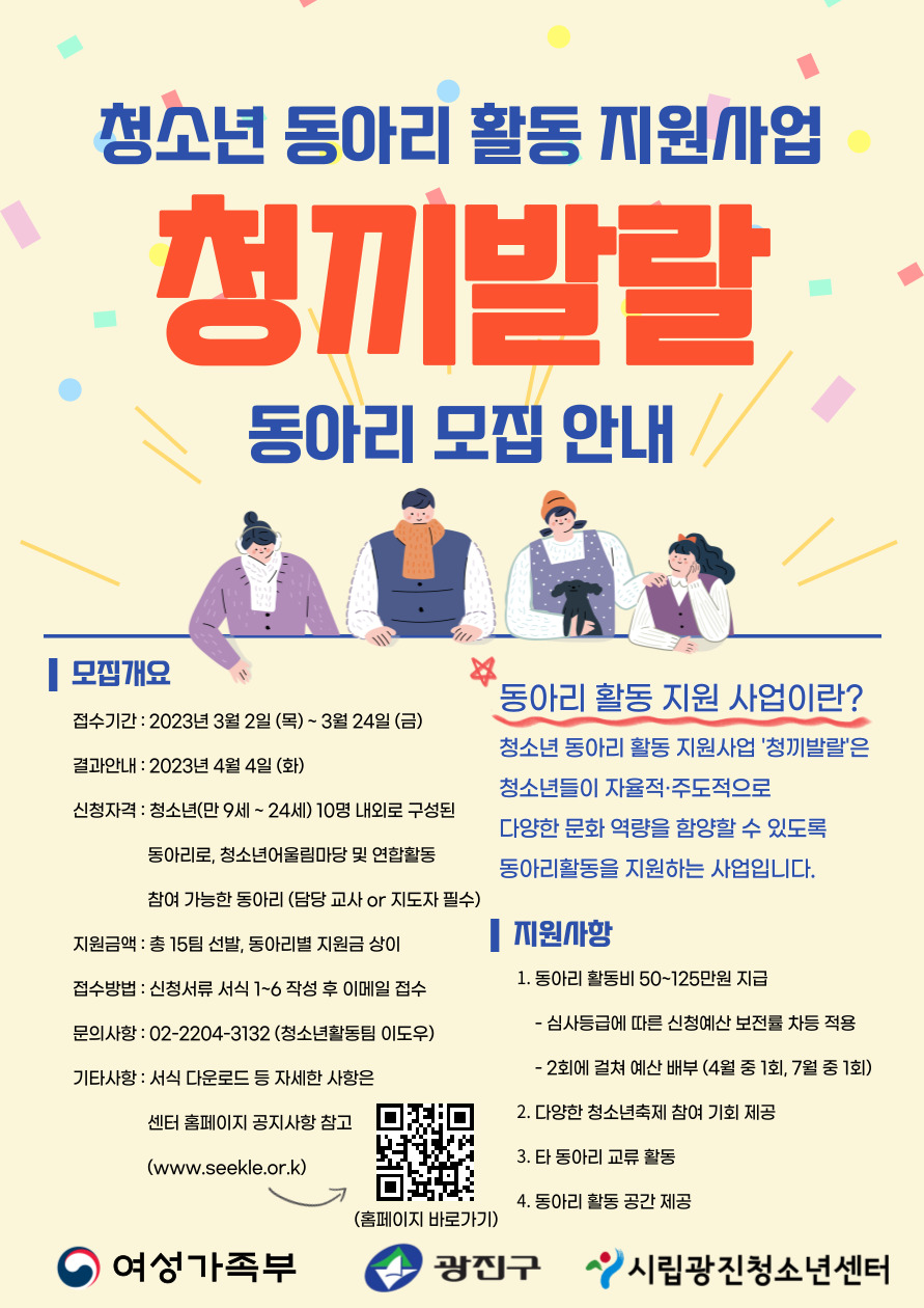 | 2023 ±¤Áø±¸ û¼Ò³â µ¿¾Æ¸® Ȱµ¿ Áö¿ø »ç¾÷ 'û³¢¹ß¶ö' Âü¿© µ¿¾Æ¸® ¸ðÁý¾È³» (~3/27) | ||||