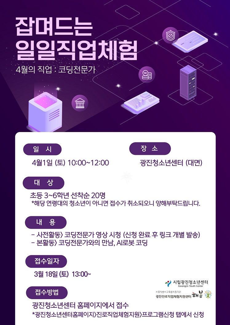 4¿ù Àâ¸çµå´Â ÀÏÀÏÁ÷¾÷üÇè(ÄÚµùÀü¹®°¡)À» ´ÙÀ½°ú °°ÀÌ ½ÃÇàÇÕ´Ï´Ù. 4¿ù 1ÀÏ Åä¿äÀÏ, 10½Ã~12½Ã±îÁö ÁøÇàµÇ¸ç, ±¤ÁøÃ»¼Ò³â¼¾ÅÍ ÁöÇÏ 1Ãþ ¼Ò±ØÀå¿¡¼ ÁøÇàµË´Ï´Ù. ÄÚµùÀü¹®°¡ Á÷¾÷ÀÎ ¸àÅä´ÔÀ» ¸¸³ª ÄÚµùÀü¹®°¡ Á÷¾÷¿¡ ´ëÇÑ À̾߱⵵ µè°í, AI·Îº¿ ÄÚµù ½Ç½ÀÀ» ÇØº¸´Â Ȱµ¿ÀÔ´Ï´Ù.