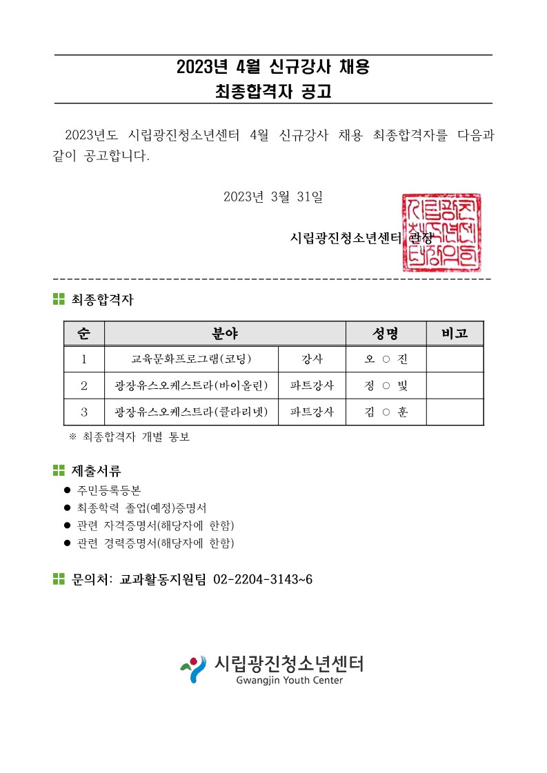 | [°»çä¿ëÇÕ°ÝÀÚ°ø°í] 2023³â 4¿ù ½Å±Ô°»ç ä¿ë ÃÖÁ¾ ÇÕ°ÝÀÚ °ø°í | ||