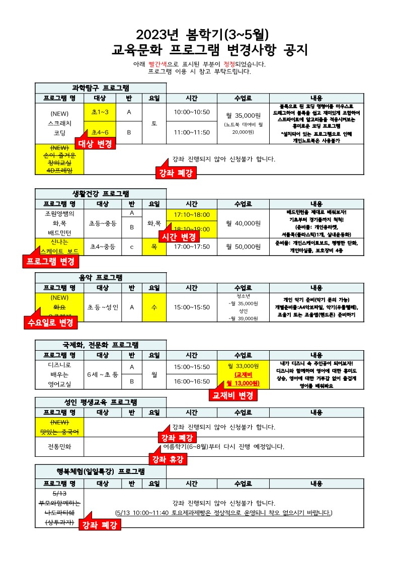 | 2023³â º½Çбâ(3~5¿ù) ±³À°¹®ÈÇÁ·Î±×·¥ º¯°æ»çÇ× °øÁö(4.11.±âÁØ) | ||