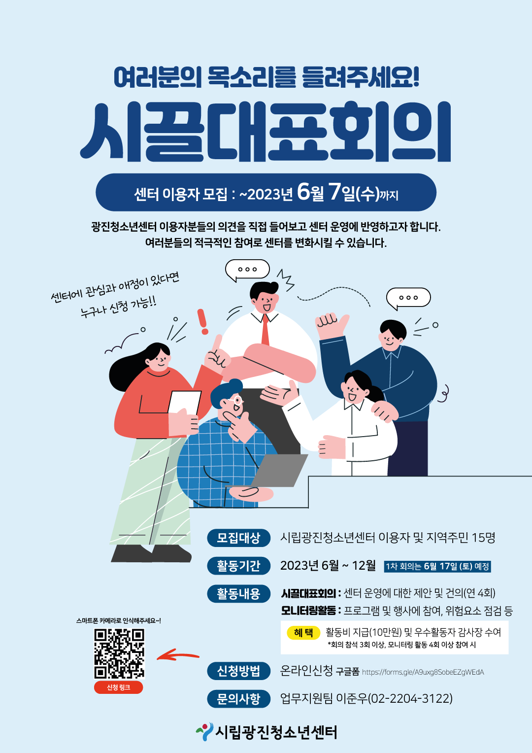¤· ¸ðÁý´ë»ó : ½Ã¸³±¤ÁøÃ»¼Ò³â¼¾ÅÍ ÀÌ¿ëÀÚ ¹× Áö¿ªÁֹΠ15¸í ¤· ¸ðÁý±â°£ : 2023.6.7.(¼ö)±îÁö Ãß°¡¸ðÁý ¤· Ȱµ¿±â°£ : 2023³â 6¿ù ~ 12¿ù - 1Â÷ ȸÀÇ´Â 2023³â 6¿ù 17ÀÏ ÁøÇà ¿¹Á¤ ¤· Ȱµ¿³»¿ë - [½Ã²ø´ëǥȸÀÇ] ¼¾ÅÍ ¿î¿µ¿¡ ´ëÇÑ Á¦¾È ¹× °ÇÀÇ(¿¬ 4ȸ) - [¸ð´ÏÅ͸µÈ°µ¿] ÇÁ·Î±×·¥ ¹× Çà»ç¿¡ Âü¿©, À§Çè¿ä¼Ò Á¡°Ë µî
