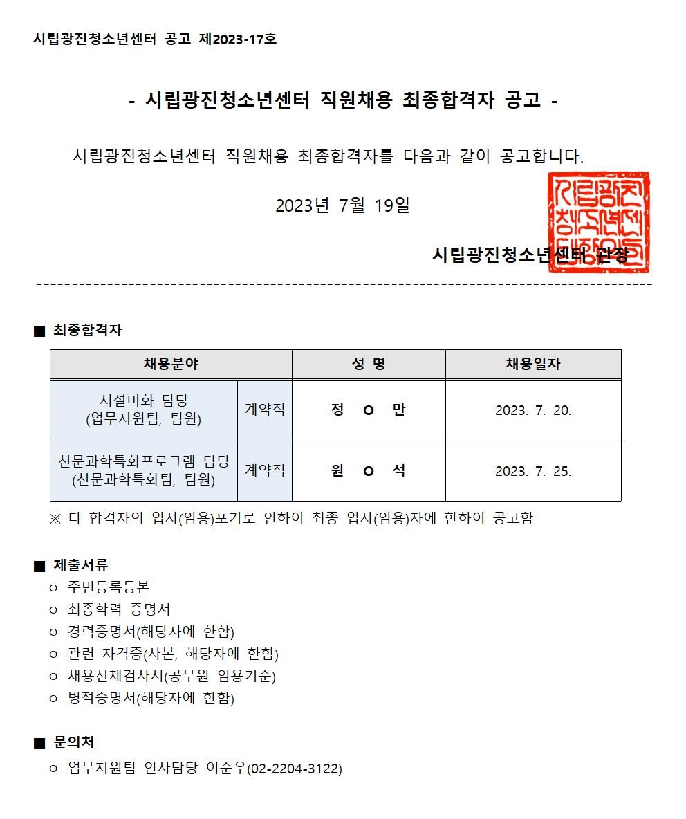 | [ä¿ë] ½Ã¸³±¤ÁøÃ»¼Ò³â¼¾ÅÍ Á÷¿ø ä¿ë ÃÖÁ¾ÇÕ°ÝÀÚ °ø°í(½Ã¼³¹ÌÈ, õ¹®°úÇÐÆ¯È) | ||
