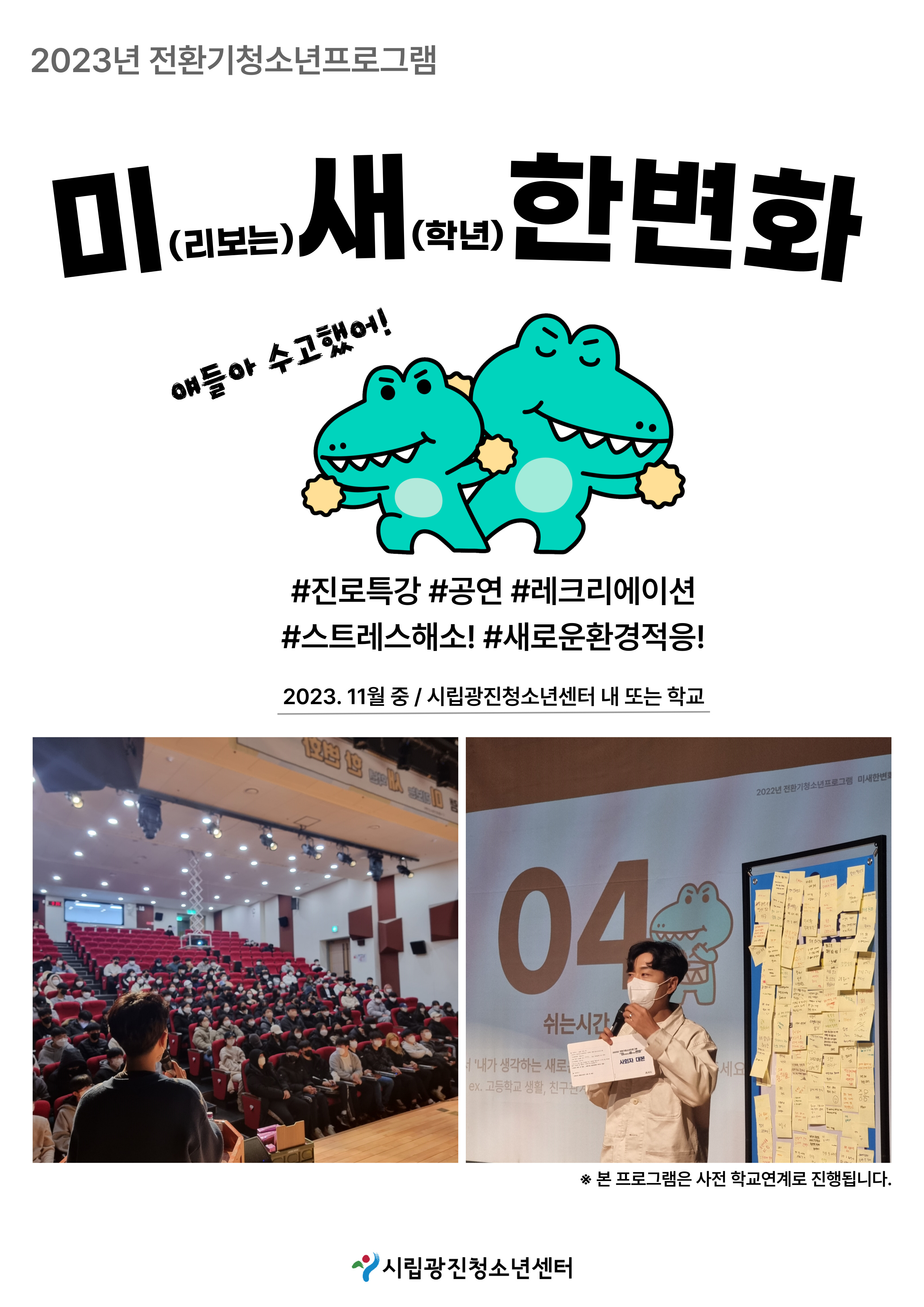 | 2023³â Àüȯ±âû¼Ò³âÇÁ·Î±×·¥ "¹Ì(¸®º¸´Â)»õ(Çгâ)ÇÑ º¯È"(»çÀü Çб³¿¬°è) | ||