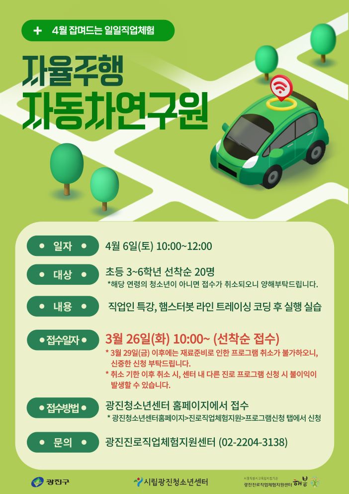 ¡ÛÀϽà : 4¿ù 6ÀÏ(Åä) 10:00~12:00 ¡ÛÀå¼Ò : ±¤ÁøÃ»¼Ò³â¼¾ÅÍ(´ë¸é) ¡Û´ë»ó : Ãʵî 3~6Çгâ 20¸í ¡Û³»¿ë : ÀÚÀ²ÁÖÇàÀÚµ¿Â÷°³¹ß°¡ Á÷¾÷¼Ò°³, ÀÚÀ²ÁÖÇà ·Îº¿ ÄÚµù ¹× ÁÖÇà ½Ç½À ¡ÛÁ¢¼öÀÏÀÚ : 3¿ù 26ÀÏ(È) 10:00~ ¡ÛÁ¢¼ö¹æ¹ý : https://www.seekle.or.kr/sub06/sub04_view.php?p_id=276&page=1& ¡Û±âŸ¾È³»: Ãë¼Ò ½Ã, ¹Ýµå½Ã ´ã´çÀÚ¿¡°Ô ¿¬¶ô ºÎʵ右´Ï´Ù. (02-2204-3138) À§ ½Åû¸µÅ© ³» °Ô½Ã±ÛÀ» ¹Ýµå½Ã Á¤µ¶ ÈÄ ½Åû ºÎʵ右´Ï´Ù! °Ô½Ã±ÛÀ» ÀÐÁö ¾Ê°í ¹ß»ýÇÏ´Â ºÒÀÌÀÍÀº Ã¥ÀÓÁöÁö ¾Ê½À´Ï´Ù😥