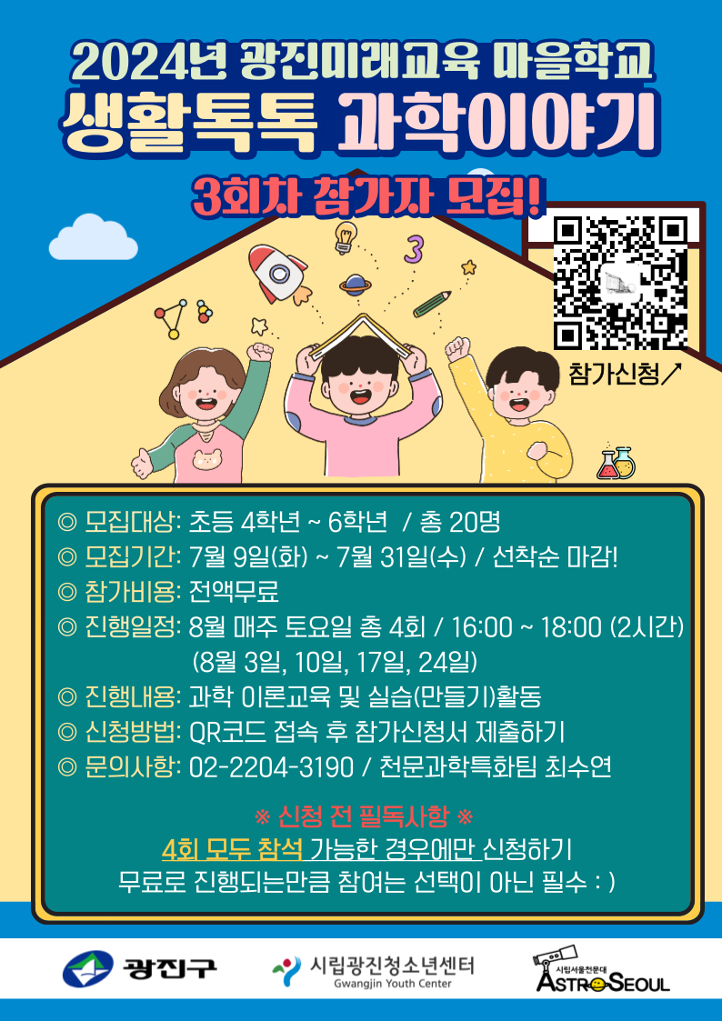 | 2024³â ±¤Áø¹Ì·¡±³À° ¸¶À»Çб³ '»ýȰÅåÅå °úÇÐÀ̾߱â' 3ȸÂ÷(8¿ù) Âü°¡ÀÚ ¸ðÁý ¾È³» | ||
