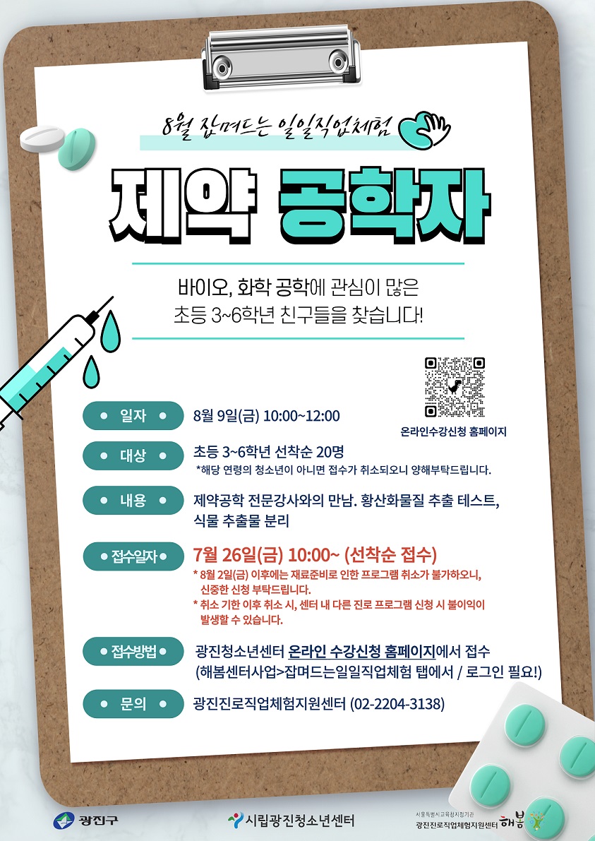 ----- Àâ¸çµå´Â ÀÏÀÏÁ÷¾÷üÇè (´ë±âÀÚ ¸ðÁýÁß) ¡ÛÀϽà : 8¿ù 9ÀÏ(±Ý) 10:00~12:00 ¡Û´ë»ó : Ãʵî 3~6Çгâ 20¸í ¡Û³»¿ë : Á¦¾à°øÇÐ Àü¹®°»ç¿ÍÀÇ ¸¸³² ¹× °ü·Ã Áø·ÎŽ»ö, Ȳ»êÈ ¹°Áú ÃßÃâ ¹× ½Ä¹° ÃßÃâ ¹°Áú ºÐ¼® ½ÇÇè ¡ÛÁغñ¹°: ¹«·á ¡ÛÁ¢¼öÀÏÀÚ : 7¿ù 26ÀÏ(±Ý) 10:00~ ¡ÛÁ¢¼ö¹æ¹ý : ¿Â¶óÀÎ ¼ö°½Åû ÆäÀÌÁö¸¦ ÀÌ¿ëÇÑ ¿Â¶óÀÎ Á¢¼ö (·Î±×ÀÎ Çʼö!) ** üÇè!Á÷¾÷ÇöÀå(Çö´ë¸ðÅͽºÆ©µð¿À ¹æ¹® / 8.10.(Åä) Ȱµ¿ / ÃÊ5~Áß1) µµ ¸¹Àº °ü½É ºÎʵ右´Ï´Ù. (°Ô½Ã±ÛÀ» ²À È®ÀÎÇØÁÖ¼¼¿ä¢º https://www.seekle.or.kr/sub07/sub01.php?ptype=view&idx=20707&page=1&code=notice0 )