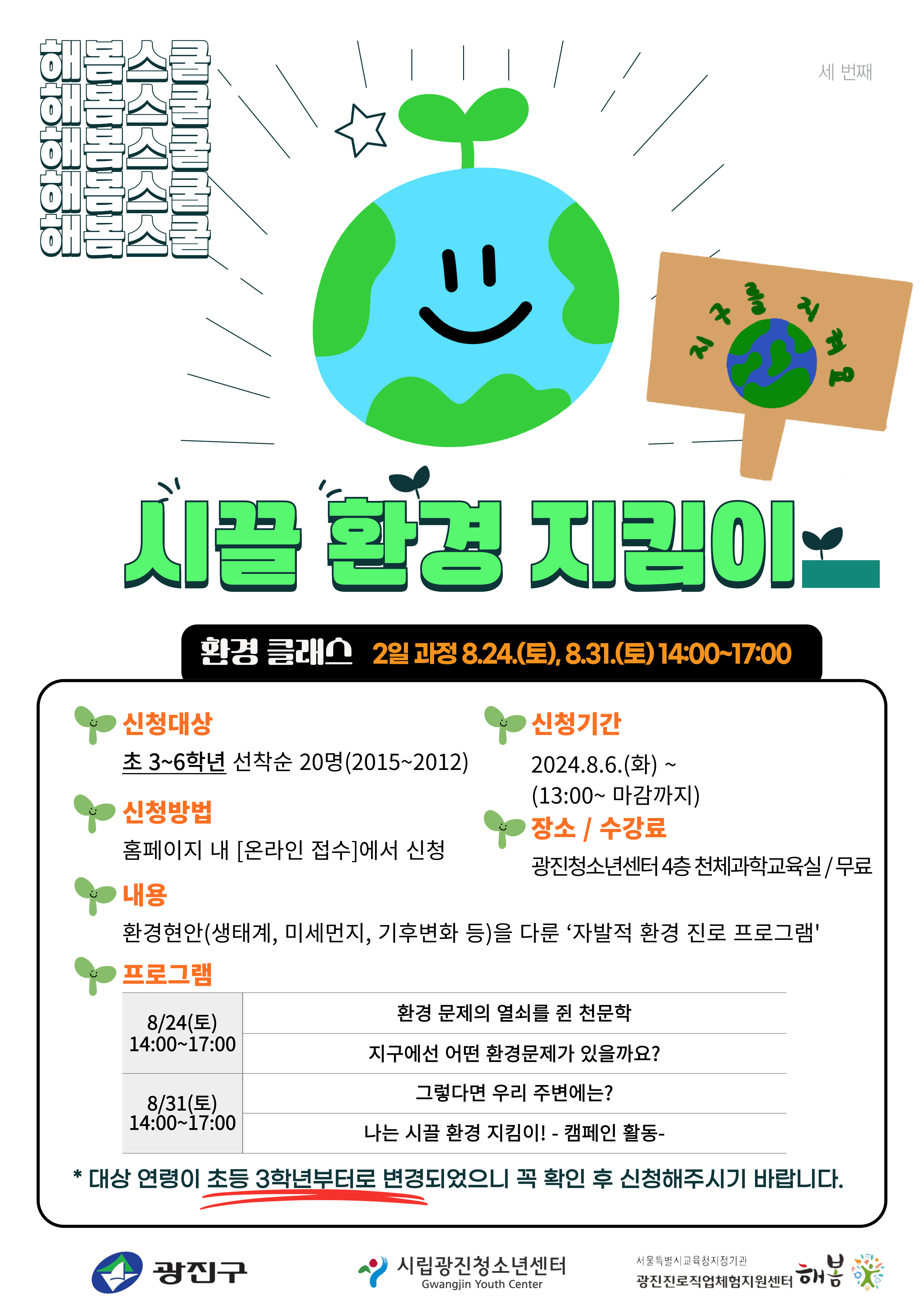 8¿ù ÇØº½½ºÄð '½Ã²ø ȯ°æ ÁöÅ´ÀÌ' (12¸í Ãß°¡ ¸ðÁýÁß) ¡ÛÀϽà : 8¿ù 24ÀÏ(Åä), 8¿ù 31ÀÏ(Åä) 14:00~17:00 (2ȸ±â ÇÁ·Î±×·¥) ¡Û³»¿ë : ±¤ÁøÃ»¼Ò³â¼¾ÅÍÀÇ [ȯ°æ ÁöÅ´ÀÌ]µéÀÌ ¹úÀÌ´Â ¿ì´çÅÁÅÁ ÀÚ¹ßÀû ȯ°æ Ȱµ¿! ¡ÛÀå¼Ò: ½Ã¸³±¤ÁøÃ»¼Ò³â¼¾ÅÍ 4Ãþ õ¹® °úÇÐ ±³À°½Ç ¡ÛÁغñ¹°: ¾øÀ½(ÇÊ¿ä½Ã ¹®Àھȳ» ¿¹Á¤) ¡ÛÃß°¡Á¢¼öÀÏÁ¤ : 8¿ù 6ÀÏ(È) 13:00~ ¡ÛÁ¢¼ö¹æ¹ý : ¿Â¶óÀÎ ¼ö°½Åû ÆäÀÌÁö¸¦ ÀÌ¿ëÇÑ ¿Â¶óÀÎ Á¢¼ö (·Î±×ÀÎ Çʼö!)