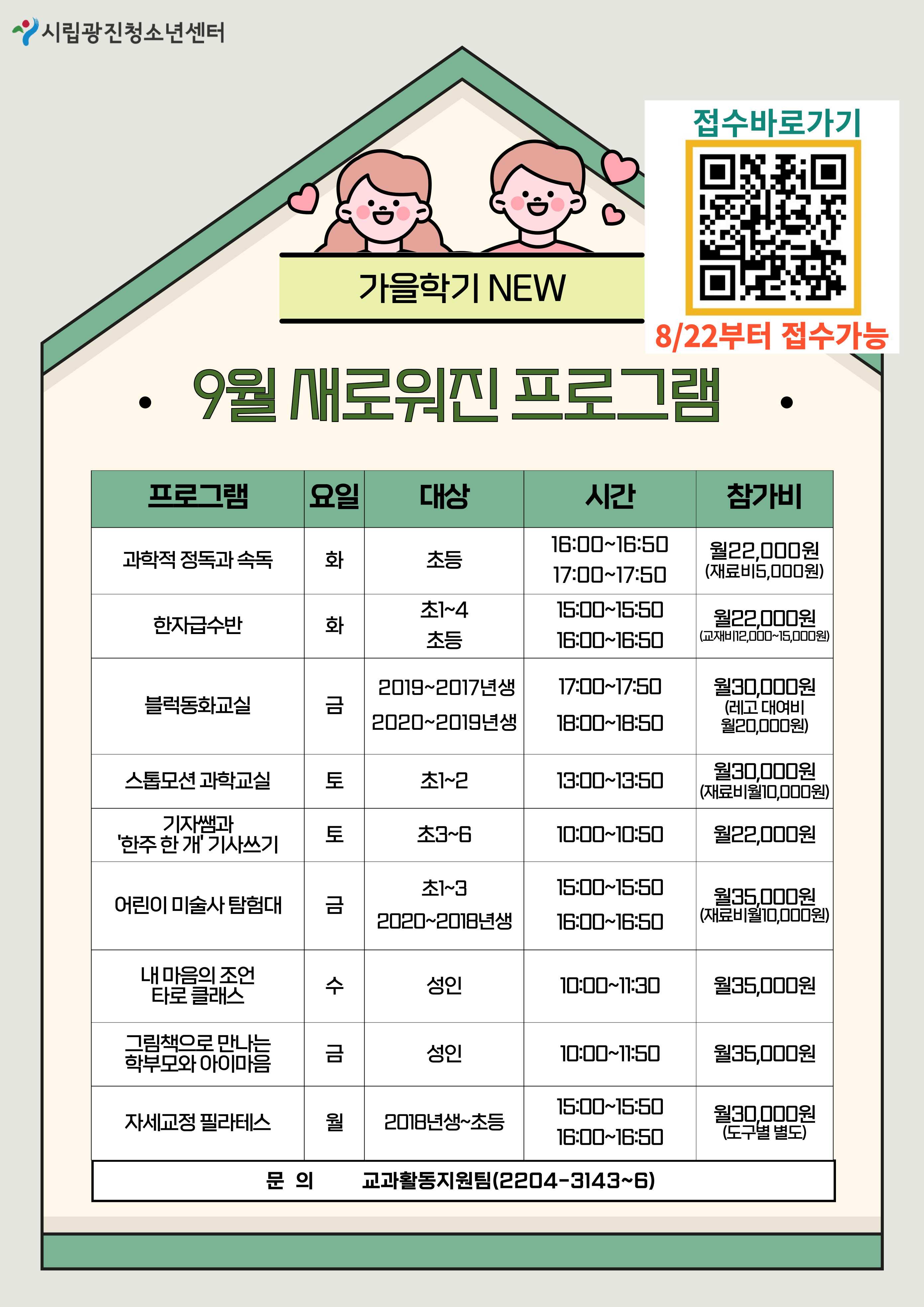 | (¸ðÁý¾È³») 9¿ù »õ·Î»ý±ä NEW ±³À°¹®ÈÇÁ·Î±×·¥ | ||