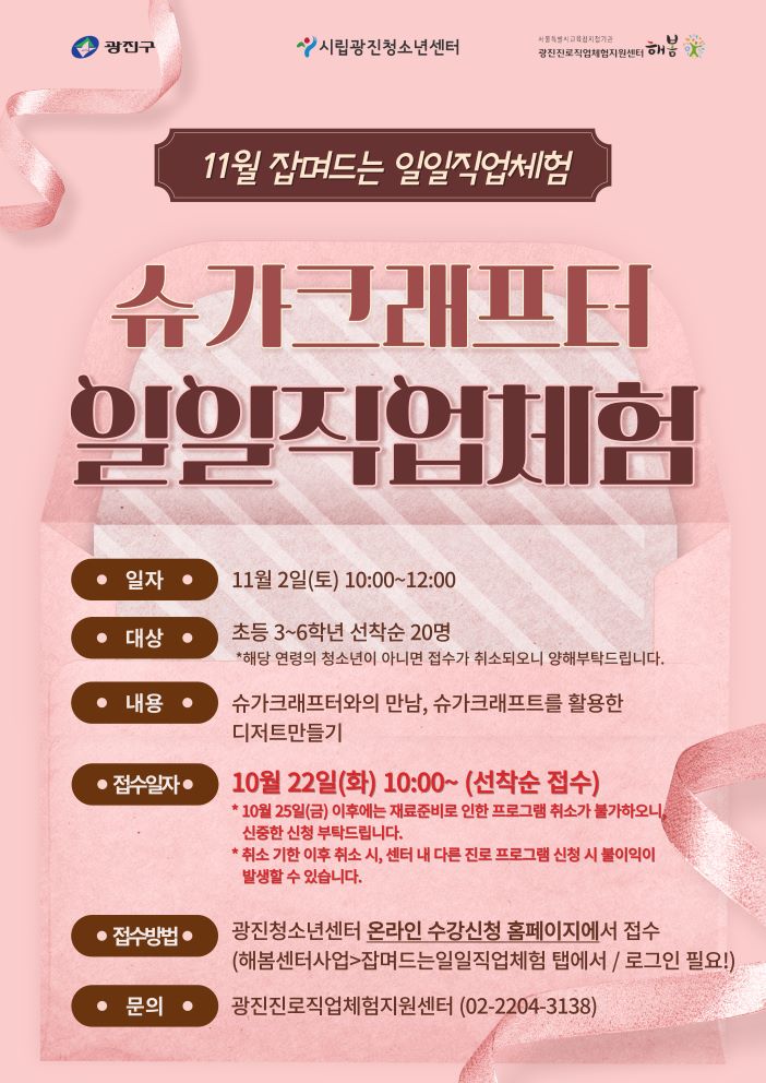 ¡ÛÀϽà : 11¿ù 2ÀÏ(Åä) 10:00~12:00 ¡Û´ë»ó : Ãʵî 3~6Çгâ 20¸í ¡Û³»¿ë : ½´°¡Å©·¡ÇÁÅÍ Á÷¾÷ÀΰúÀÇ ¸¸³² ¹× Á÷¾÷ÀÌÇØ, ½´°¡Å©·¡ÇÁÆ®¸¦ Ȱ¿ëÇÑ µðÀúÆ® ¸¸µé±â ¡ÛÁغñ¹°: ¹«·á ¡ÛÁ¢¼öÀÏÀÚ : 10¿ù 22ÀÏ(È) 10:00~ ¡ÛÁ¢¼ö¹æ¹ý : ¿Â¶óÀÎ ¼ö°½Åû ÆäÀÌÁö¸¦ ÀÌ¿ëÇÑ ¿Â¶óÀÎ Á¢¼ö (·Î±×ÀÎ Çʼö!)