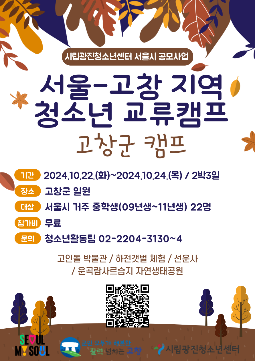 ¼¿ï½Ã °ø¸ð»ç¾÷ÀÇ ÀÏȯÀ¸·Î °íⱺû¿¡¼ ¿î¿µÇÏ´Â ¼¿ï-°íâ û¼Ò³â ±³·ùÄ·ÇÁ(°íâ¹æ¹®) Âü°¡ÀÚ¸¦ ¸ðÁýÇÕ´Ï´Ù. *º» Ä·ÇÁ´Â ½Ã¸³±¤ÁøÃ»¼Ò³â¼¾ÅͰ¡ °íⱺû°úÀÇ Çù·ÂÇÏ¿¡ Âü°¡ÀÚ ¸ðÁý, ÀÎ¼Ö µîÀ» ´ã´çÇϸç, Ä·ÇÁ ¿î¿µ Àü¹ÝÀº °íⱺûÀÌ Àü´ãÇÏ´Â ¹Ù¸¦ ¾Ë¸³´Ï´Ù.