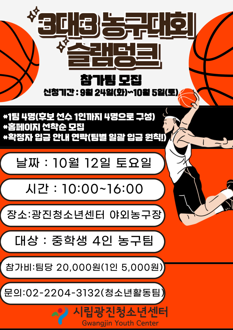 -ÀϽà : 10¿ù 12ÀÏ(Åä) 10:00~16:00 -Àå¼Ò : ½Ã¸³±¤ÁøÃ»¼Ò³â¼¾ÅÍ ¾ß¿Ü³ó±¸Àå -´ë»ó : ÁßÇлý 4ÀÎ ³ó±¸ÆÀ 16ÆÀ ¸ðÁý! -½Åû±â°£ : 9.24(È)~10.5(Åä) 16:00±îÁö -½Åû¹æ¹ý : û¼Ò³âȰµ¿-û¼Ò³âȰµ¿½Åû-½½·¥µ¢Å© ½Åû! *Âü°¡ÀÚ¸í¿¡ ÆÀ 4¸í À̸§ ´Ù ½áÁÖ¼¼¿ä. ±× ¿Ü »çÇ×µéÀº ´ëÇ¥ Çлý 1¸í Á¤º¸¸¸ ±âÀÔÇØÁÖ¼¼¿ä! -½Åû¸µÅ© : ½Ã¸³±¤ÁøÃ»¼Ò³â¼¾ÅÍ (seekle.or.kr) -¹®ÀÇ : 02-2204-3132