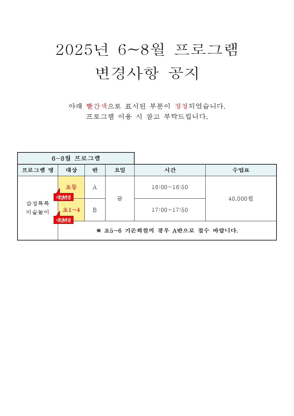 | [º¯°æ»çÇ׾ȳ»] 6~8¿ù ±³À°¹®ÈÇÁ·Î±×·¥ °¨Á¤ÅåÅå ¹Ì¼ú³îÀÌ ´ë»óº¯°æ¾È³» | ||