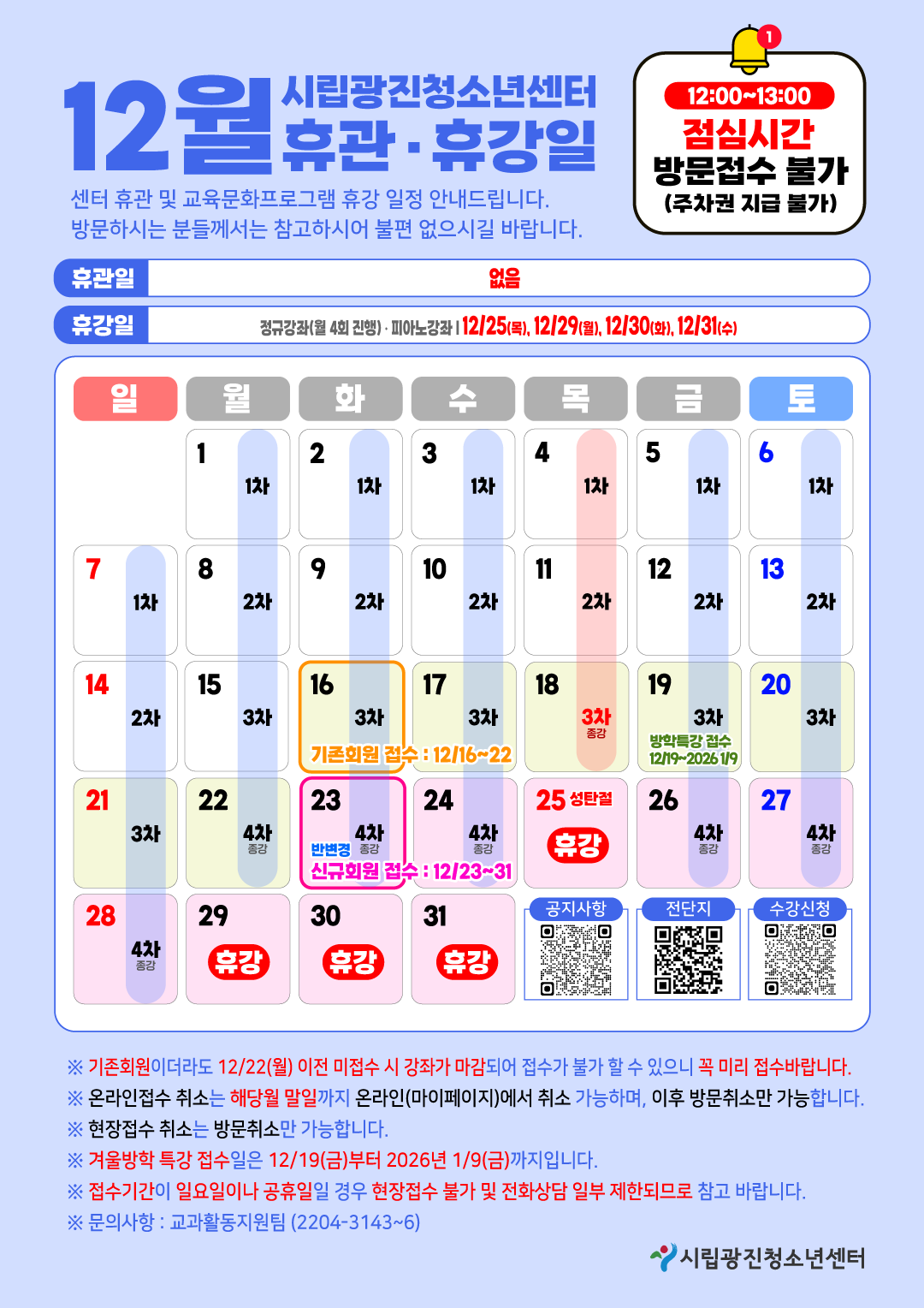 ¡Ø ±âÁ¸È¸¿øÀÌ´õ¶óµµ 12/22(¿ù) ÀÌÀü ¹ÌÁ¢¼ö ½Ã °Á°¡ ¸¶°¨µÇ¾î Á¢¼ö°¡ ºÒ°¡ ÇÒ ¼ö ÀÖÀ¸´Ï ²À ¹Ì¸® Á¢¼ö¹Ù¶ø´Ï´Ù. ¡Ø ¿Â¶óÀÎÁ¢¼ö Ãë¼Ò´Â ÇØ´ç¿ù ¸»ÀϱîÁö ¿Â¶óÀÎ(¸¶ÀÌÆäÀÌÁö)¿¡¼ Ãë¼Ò °¡´ÉÇϸç, ÀÌÈÄ ¹æ¹®Á¢¼ö¸¸ °¡´ÉÇÕ´Ï´Ù. ¡Ø ÇöÀåÁ¢¼ö Ãë¼Ò´Â ¹æ¹®Ãë¼Ò¸¸ °¡´ÉÇÕ´Ï´Ù. ¡Ø °Ü¿ï¹æÇРƯ° Á¢¼öÀÏÀº 12/19(±Ý) ~ 2026³â 1/9(±Ý)±îÁö ÀÔ´Ï´Ù. ¡Ø Á¢¼öÀÏÀÌ ÀÏ¿äÀÏ ¶Ç´Â °øÈÞÀÏÀÏ °æ¿ì ¿Â¶óÀÎ Á¢¼ö¸¸ °¡´ÉÇÕ´Ï´Ù. (ÇöÀå Á¢¼ö ¹× ÀüÈ»ó´ã ºÒ°¡) ¡Ø ¹®ÀÇ»çÇ× : ±³°úȰµ¿Áö¿øÆÀ (2204-3143~6) |