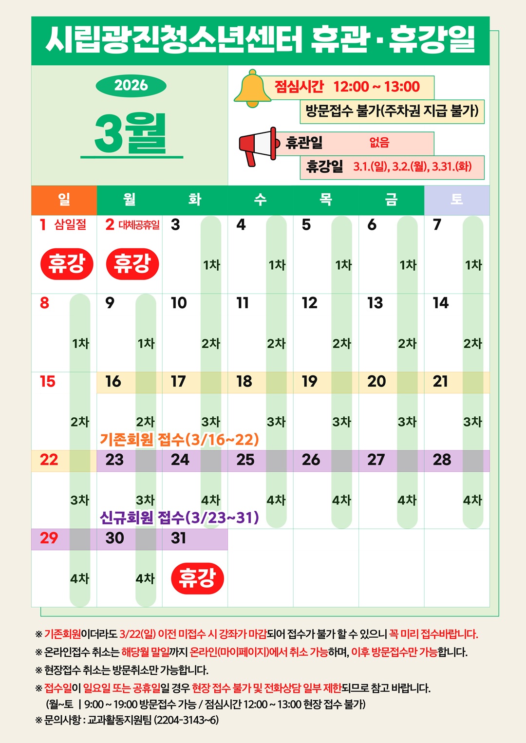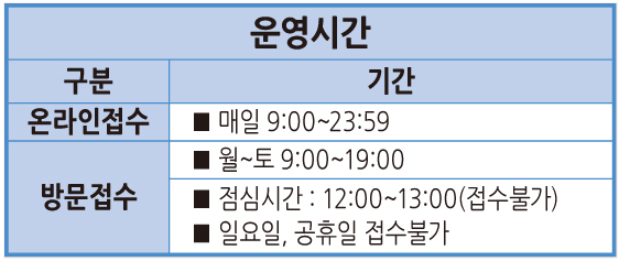<2026³â 4¿ù °Á Á¢¼öÀÏÀÚ> ¡à ±âÁ¸È¸¿ø Á¢¼ö : 3.16.(¿ù)~3.22.(ÀÏ) ¡à ±âÁ¸È¸¿ø ¹Ýº¯°æ / ½Å±Ôȸ¿ø Á¢¼ö : 3.23.(¿ù)~¸»ÀÏ ¡Ú Á¢¼ö±â°£ÀÌ ÀÏ¿äÀÏÀ̳ª °øÈÞÀÏÀÏ °æ¿ì ÇöÀåÁ¢¼ö¿Í ÀüÈ »ó´ãÀÌ ºÒ°¡ÇÏ´Ï Âü°í ÇϽñ⠹ٶø´Ï´Ù.
