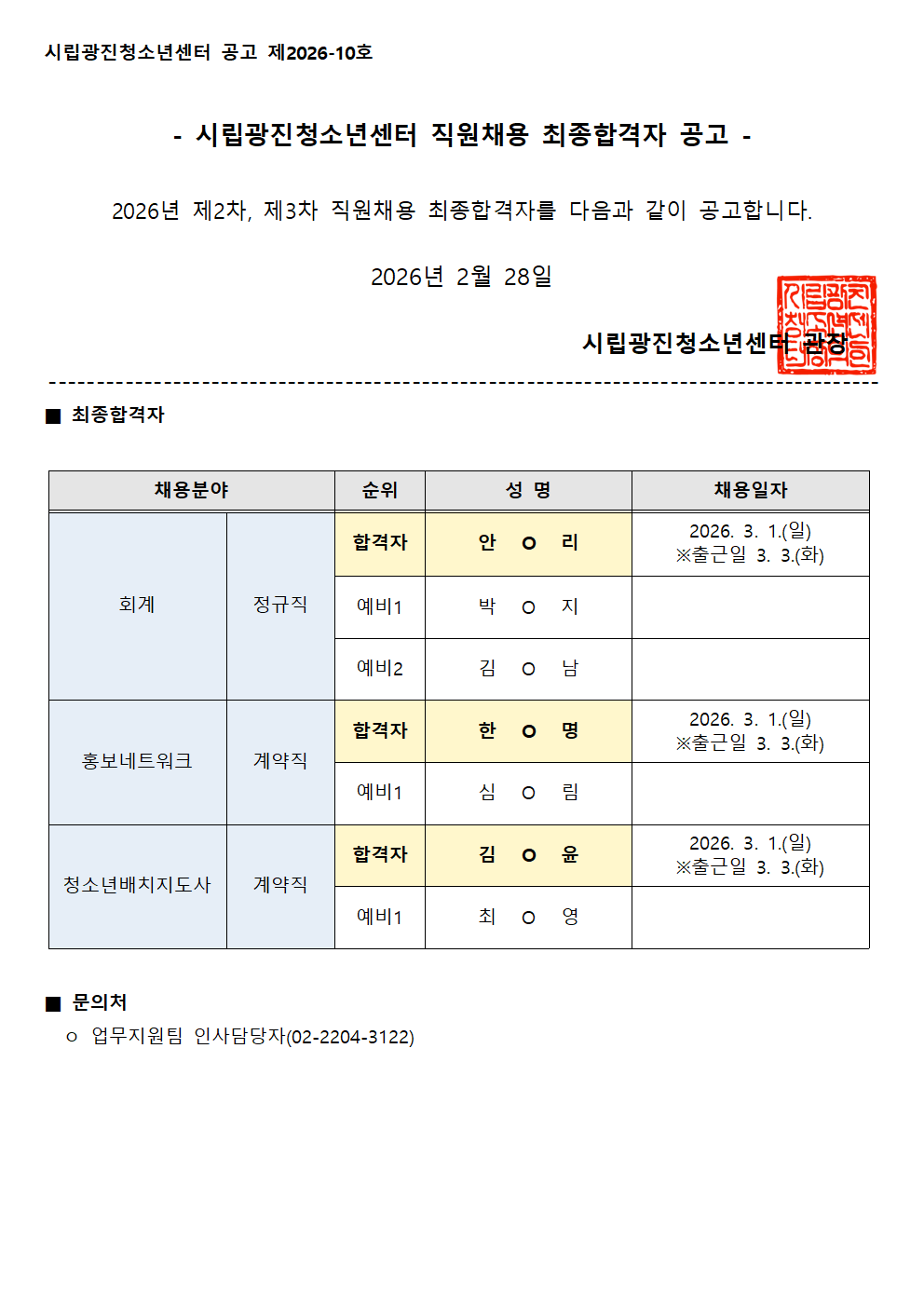 | 2026³â Á¦2Â÷, Á¦3Â÷ Á÷¿øÃ¤¿ë ÃÖÁ¾ ÇÕ°ÝÀÚ °ø°í | ||