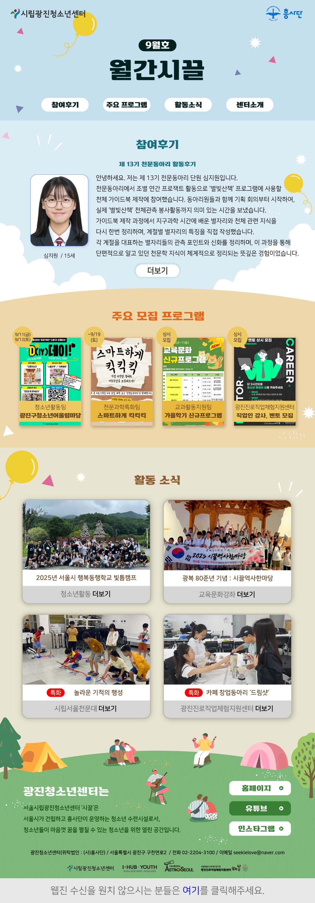 흥사단 웹진 참여후기 주요프로그램 활동소식 센터소개 참여후기 더보기 수신거부 광진청소년센터는